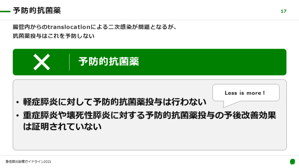 抗菌薬投与はこれを予防しない 17 急性膵炎診療ガイドライン2021 予防的抗菌薬 軽症膵炎に対して予防的抗菌薬投与は行わない