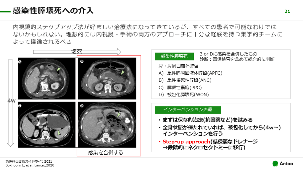 Step-up approach(低侵襲なドレナージ→段階的にネクロセクトミーに移行) インターベンション治療 4w 壊死 感染を合併する B or Dに感染を合併したもの