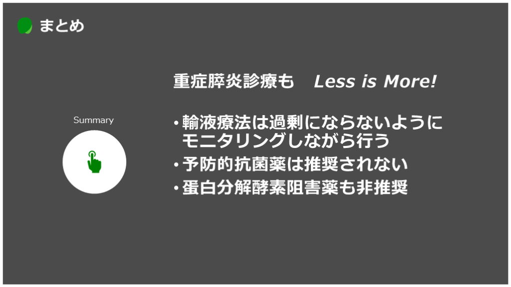 今回のガイドライン作成で行ったメタ解析では積極的輸液療法の優位性は示されなかった。 16 Working Group IAP/APA acute pancreatitis guidelines. Pancreatology 2013