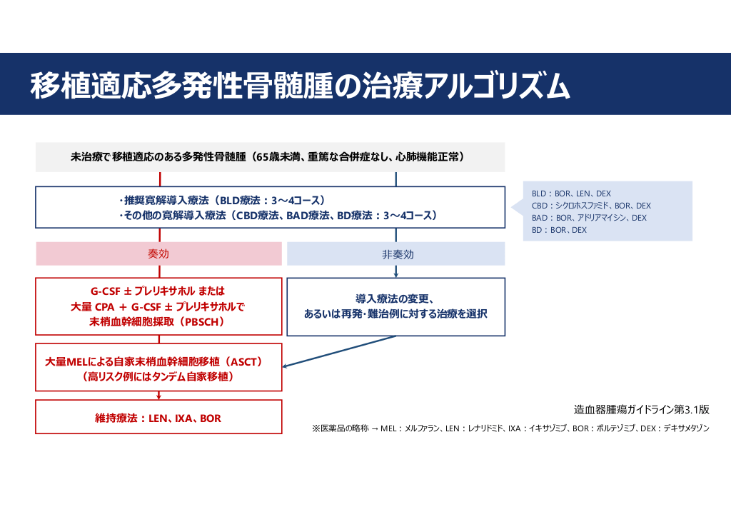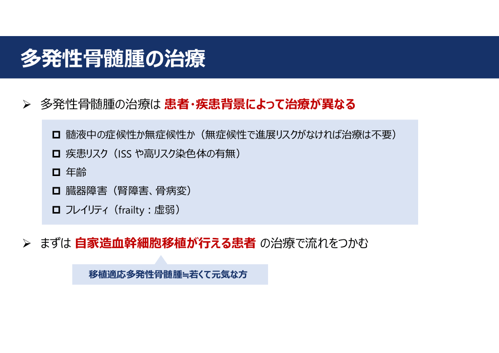 多発性骨髄腫はその治療アプローチが患者の状態に大きく依存する疾患です。本スライドでは、自家造血幹細胞移植が可能な患者における治療戦略を詳述しています。
