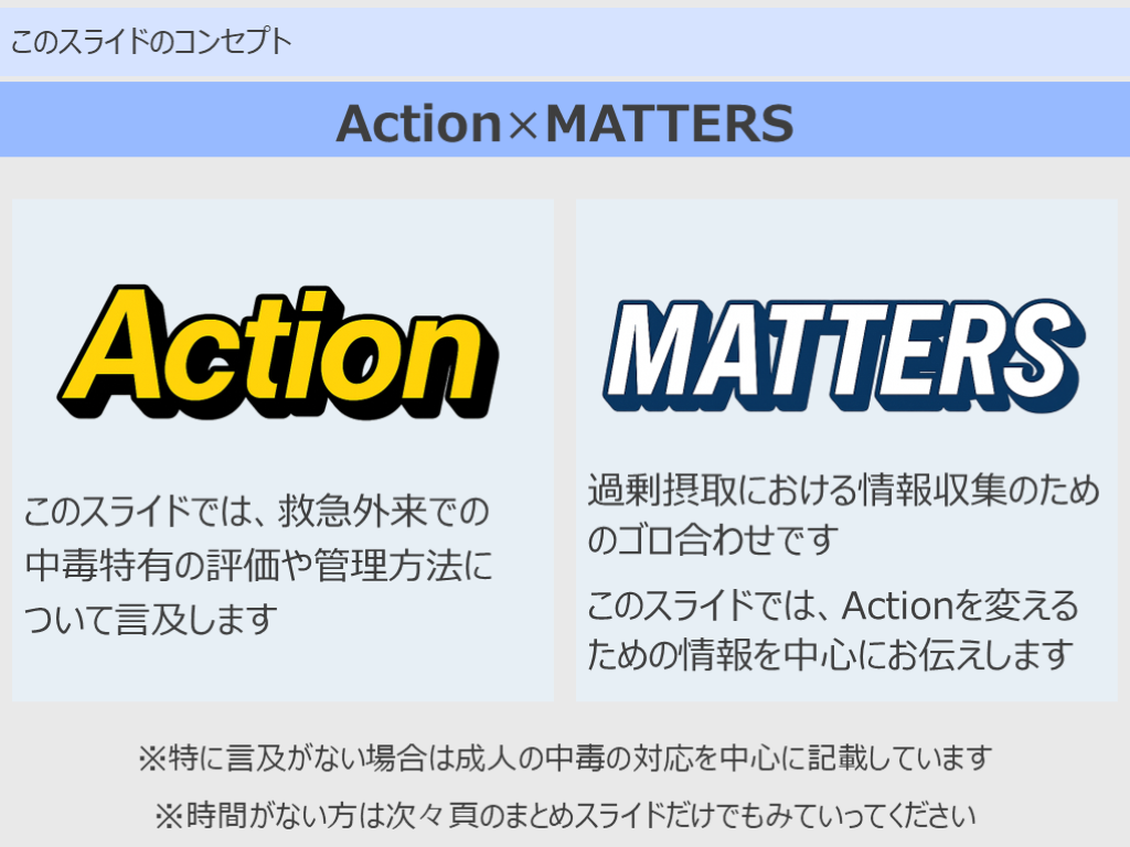 このスライドでは、Actionを変えるための情報を中心にお伝えします ※特に言及がない場合は成人の中毒の対応を中心に記載しています ※時間がない方は次々頁のまとめスライドだけでもみていってください
