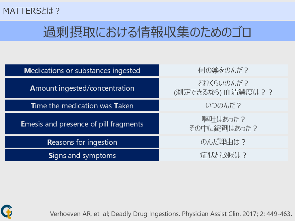 #3. MATTERSとは? 過剰摂取における情報収集のためのゴロ Verhoeven AR, et al; Deadly Drug Ingestions. Physician Assist Clin. 2017; 2: 449-463. Medications or substances ingested 何の薬をのんだ? Amount ingested/concentration どれくらいのんだ?