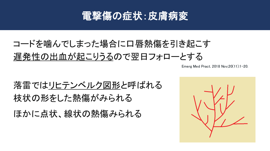 #10. 電撃傷の症状:皮膚病変 コードを噛んでしまった場合に口唇熱傷を引き起こす 遅発性の出血が起こりうるので翌日フォローとする Emerg Med Pract. 2018 Nov;20(11):1-20. 落雷ではリヒテンベルク図形と呼ばれる 枝状の形をした熱傷がみられる ほかに点状、線状の熱傷みられる