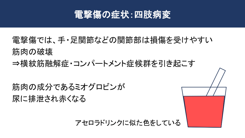 #11. 電撃傷の症状:四肢病変 電撃傷では、手・足関節などの関節部は損傷を受けやすい 筋肉の破壊 ⇒横紋筋融解症・コンパートメント症候群を引き起こす 筋肉の成分であるミオグロビンが 尿に排泄され赤くなる アセロラドリンクに似た色をしている