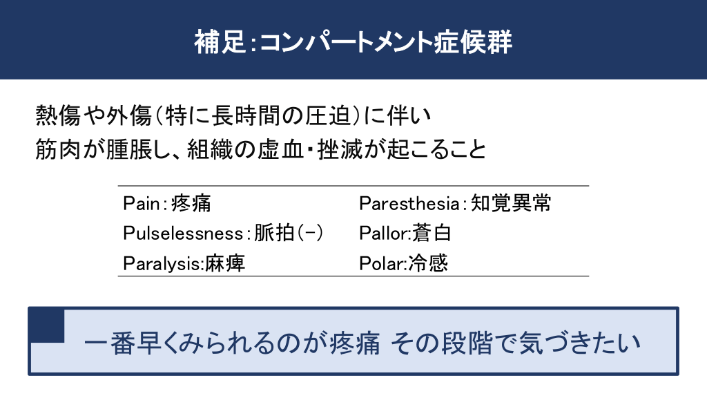 #12. 補足:コンパートメント症候群 熱傷や外傷(特に長時間の圧迫)に伴い 筋肉が腫脹し、組織の虚血・挫滅が起こること Pain:疼痛 Pulselessness:脈拍(-) Paralysis:麻痺 Paresthesia:知覚異常 Pallor:蒼白 Polar:冷感 一番早くみられるのが疼痛 その段階で気づきたい