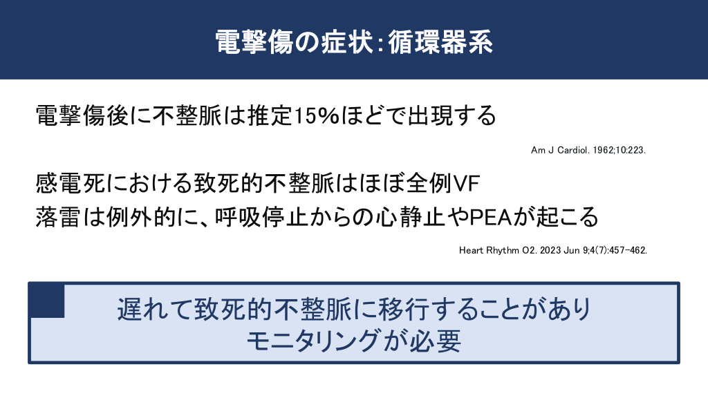 #13. 電撃傷の症状:循環器系 電撃傷後に不整脈は推定15%ほどで出現する Am J Cardiol. 1962;10:223. 感電死における致死的不整脈はほぼ全例VF 落雷は例外的に、呼吸停止からの心静止やPEAが起こる Heart Rhythm O2. 2023 Jun 9;4(7):457-462. 遅れて致死的不整脈に移行することがあり モニタリングが必要