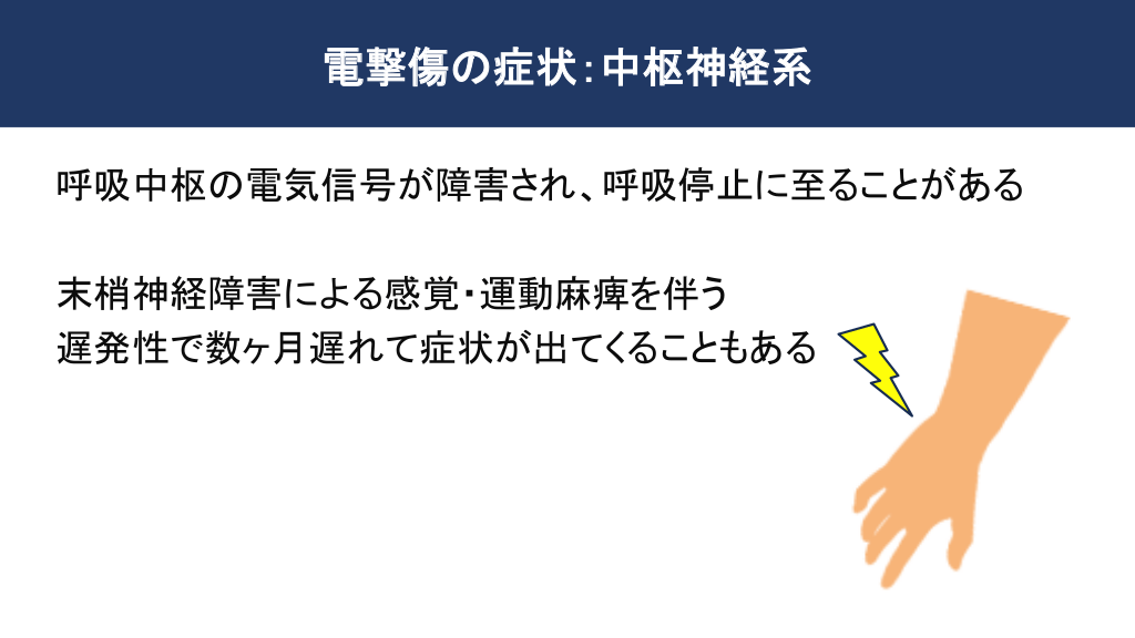 #14. 電撃傷の症状:中枢神経系 呼吸中枢の電気信号が障害され、呼吸停止に至ることがある 末梢神経障害による感覚・運動麻痺を伴う 遅発性で数ヶ月遅れて症状が出てくることもある