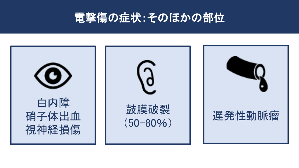 #15. 電撃傷の症状:そのほかの部位 白内障 硝子体出血 視神経損傷 鼓膜破裂 (50-80%) 遅発性動脈瘤