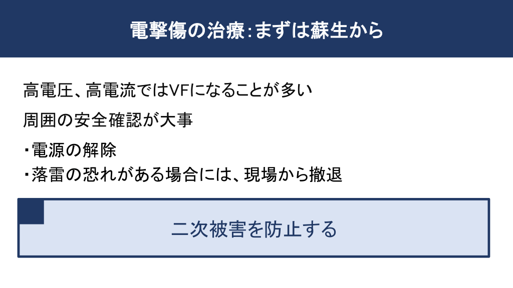 #16. 電撃傷の治療:まずは蘇生から 高電圧、高電流ではVFになることが多い 周囲の安全確認が大事 ・電源の解除 ・落雷の恐れがある場合には、現場から撤退 二次被害を防止する