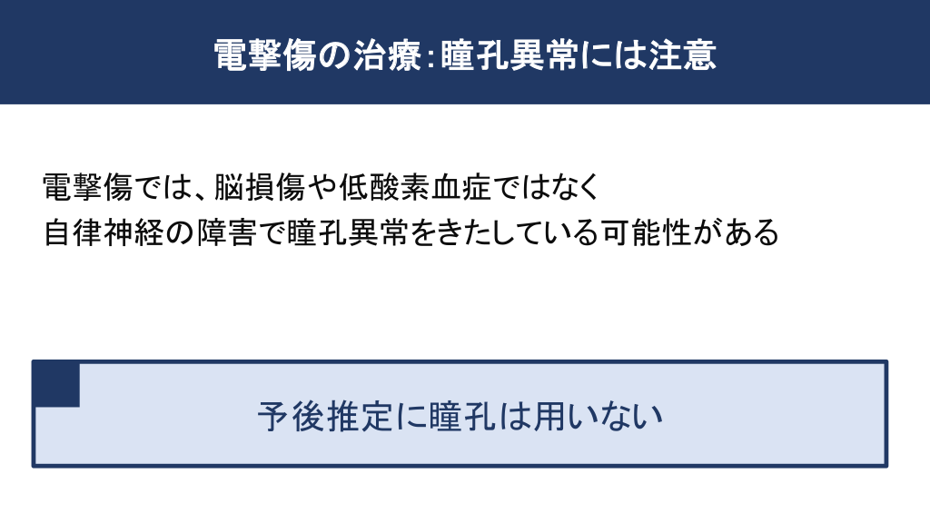 #17. 電撃傷の治療:瞳孔異常には注意 電撃傷では、脳損傷や低酸素血症ではなく 自律神経の障害で瞳孔異常をきたしている可能性がある 予後推定に瞳孔は用いない