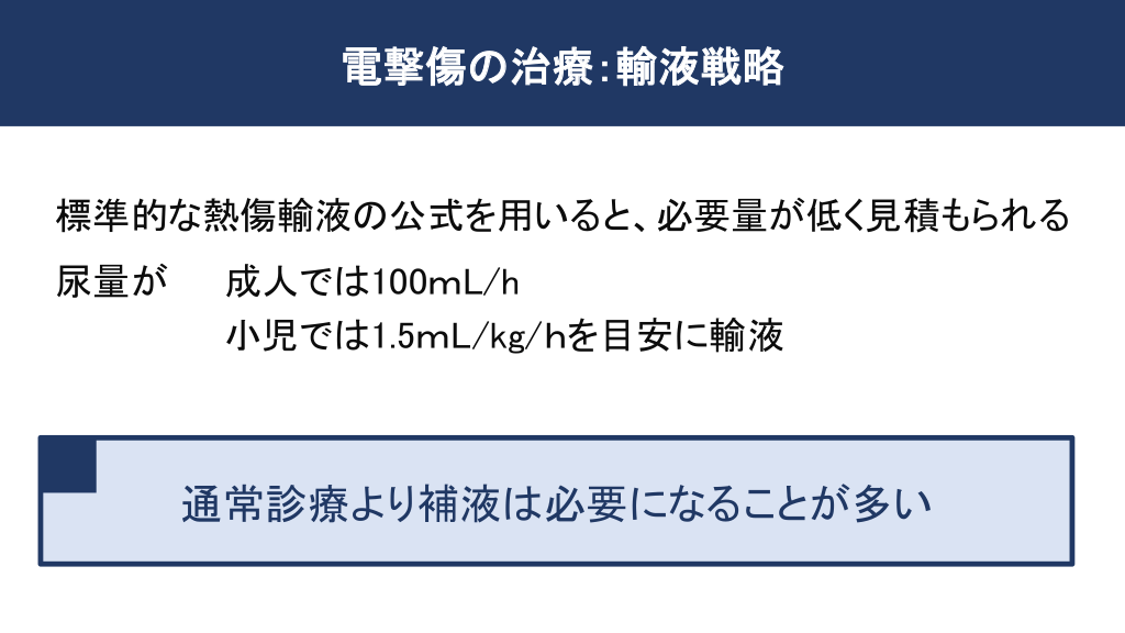 #18. 電撃傷の治療:輸液戦略 標準的な熱傷輸液の公式を用いると、必要量が低く見積もられる 尿量が 成人では100mL/h 小児では1.5mL/kg/hを目安に輸液 通常診療より補液は必要になることが多い