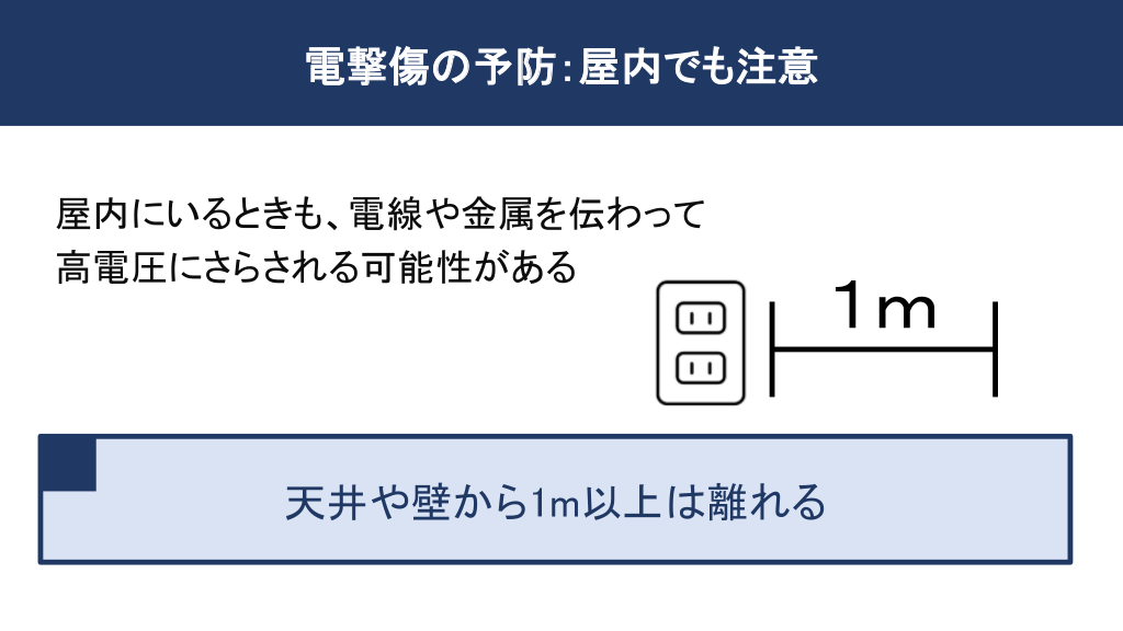 #21. 電撃傷の予防:屋内でも注意 屋内にいるときも、電線や金属を伝わって 高電圧にさらされる可能性がある 1m 天井や壁から1m以上は離れる