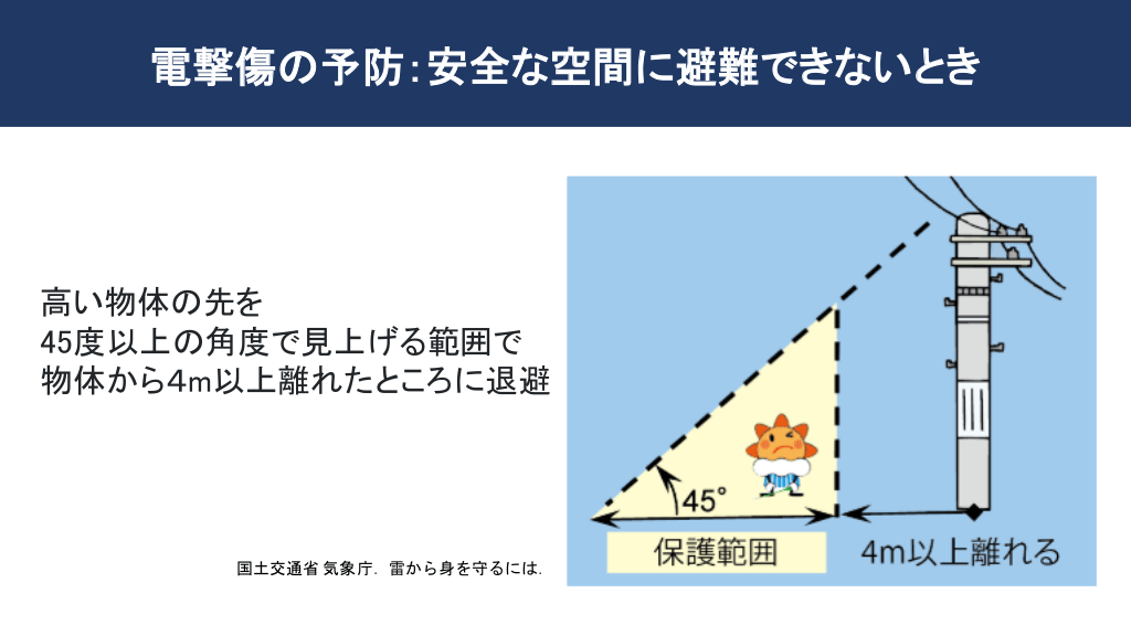 #22. 電撃傷の予防:安全な空間に避難できないとき 高い物体の先を 45度以上の角度で見上げる範囲で 物体から4m以上離れたところに退避 国土交通省 気象庁.雷から身を守るには.