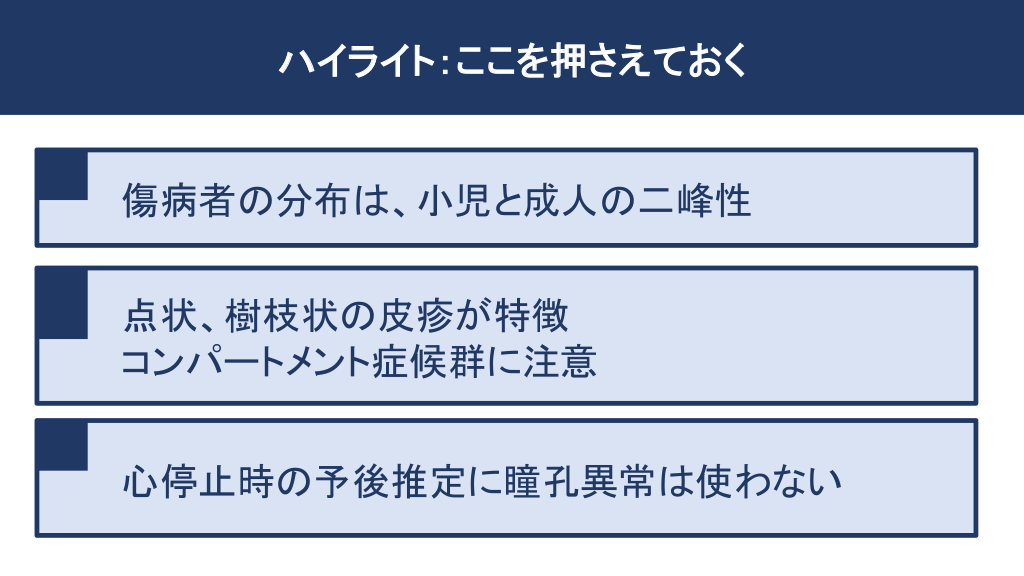 #2. ハイライト:ここを押さえておく 傷病者の分布は、小児と成人の二峰性 点状、樹枝状の皮疹が特徴 コンパートメント症候群に注意 心停止時の予後推定に瞳孔異常は使わない