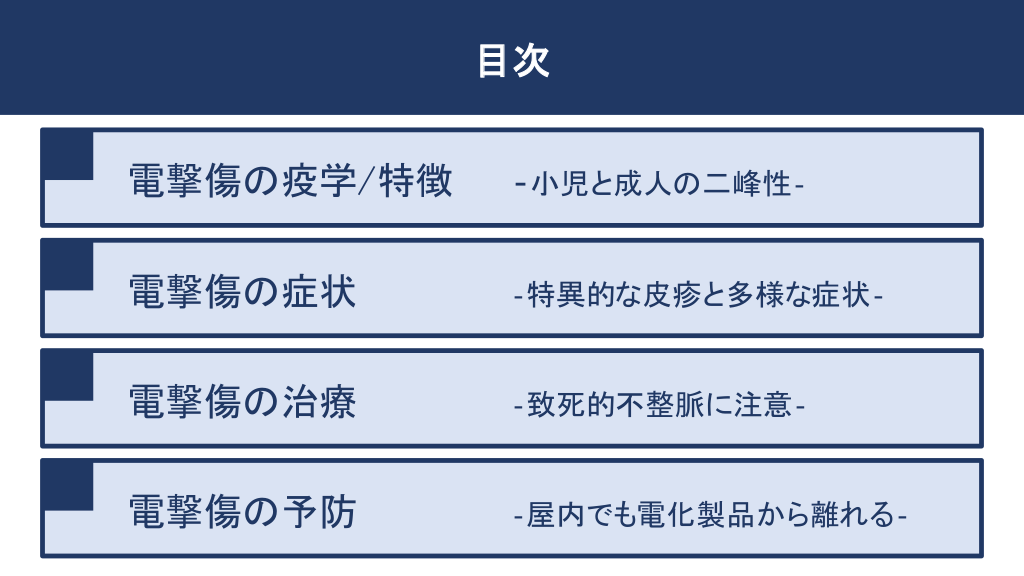 #3. 目次 電撃傷の疫学/特徴 ‐小児と成人の二峰性‐ 電撃傷の症状 ‐特異的な皮疹と多様な症状‐ 電撃傷の治療 ‐致死的不整脈に注意‐ 電撃傷の予防 ‐屋内でも電化製品から離れる‐