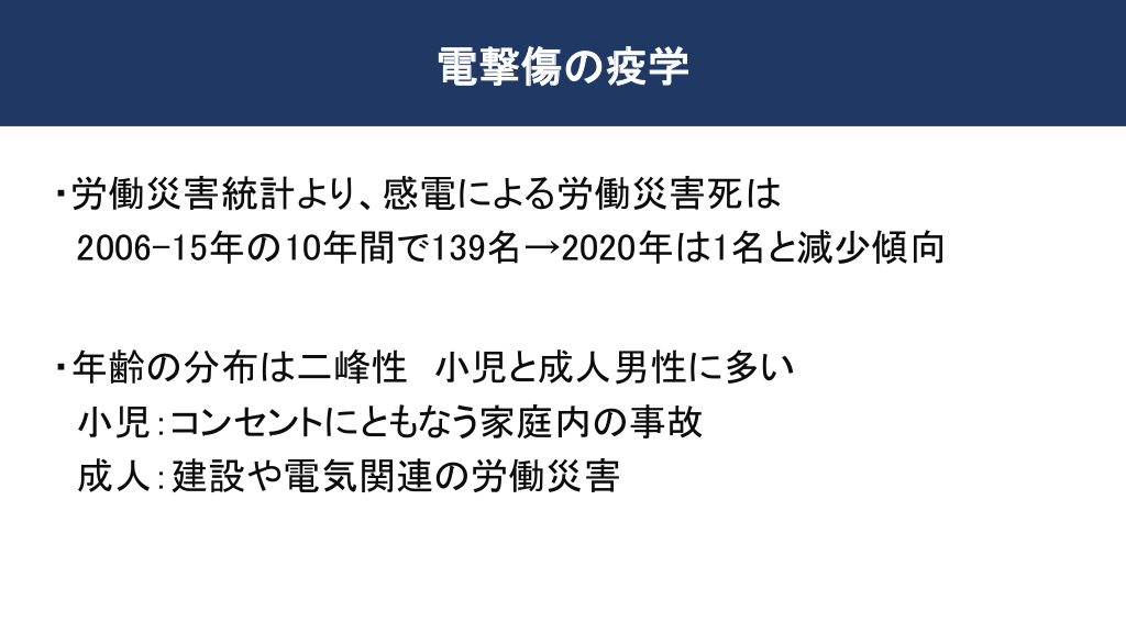#4. 電撃傷の疫学 ・労働災害統計より、感電による労働災害死は 2006-15年の10年間で139名→2020年は1名と減少傾向 ・年齢の分布は二峰性 小児と成人男性に多い 小児:コンセントにともなう家庭内の事故 成人:建設や電気関連の労働災害