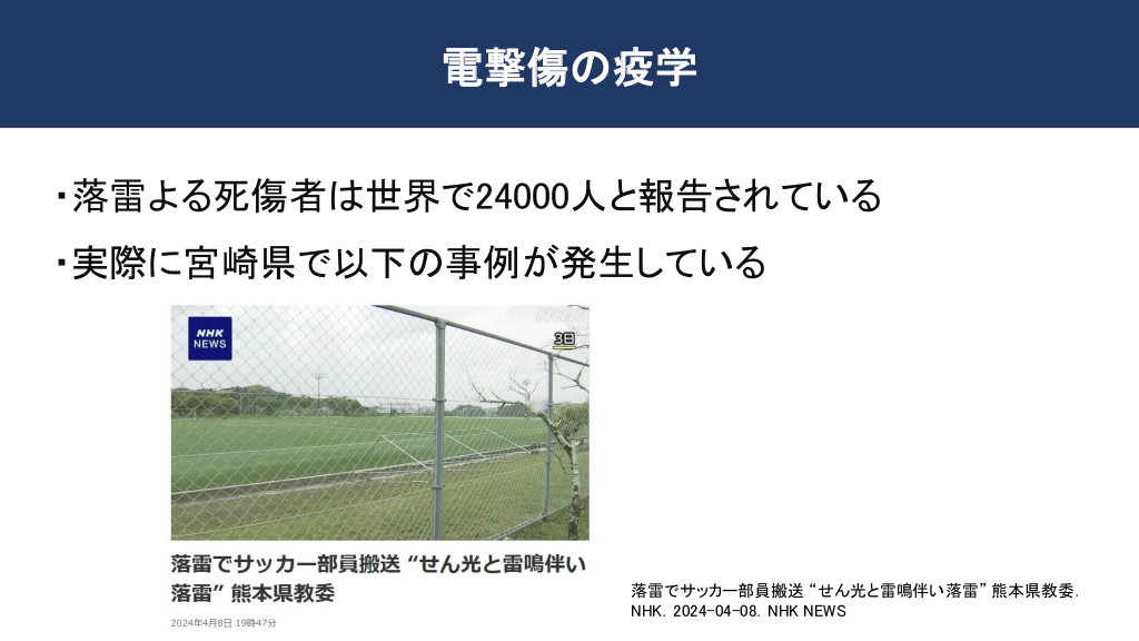 #5. 電撃傷の疫学 ・落雷よる死傷者は世界で24000人と報告されている ・実際に宮崎県で以下の事例が発生している 落雷でサッカー部員搬送 “せん光と雷鳴伴い落雷” 熊本県教委. NHK.2024-04-08.NHK NEWS