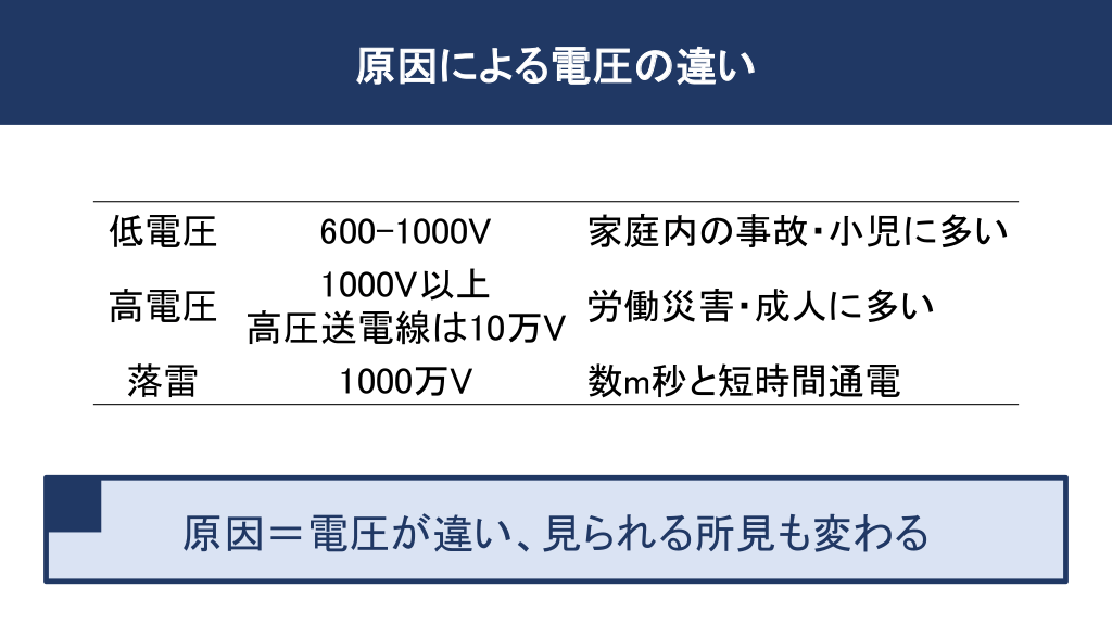 #6. 原因による電圧の違い 低電圧 600-1000V 家庭内の事故・小児に多い 1000V以上 高電圧 労働災害・成人に多い 高圧送電線は10万V 落雷 1000万V 数m秒と短時間通電 原因=電圧が違い、見られる所見も変わる