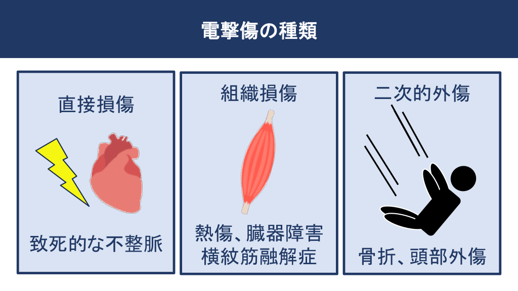 #7. 電撃傷の種類 直接損傷 致死的な不整脈 組織損傷 二次的外傷 熱傷、臓器障害 横紋筋融解症 骨折、頭部外傷