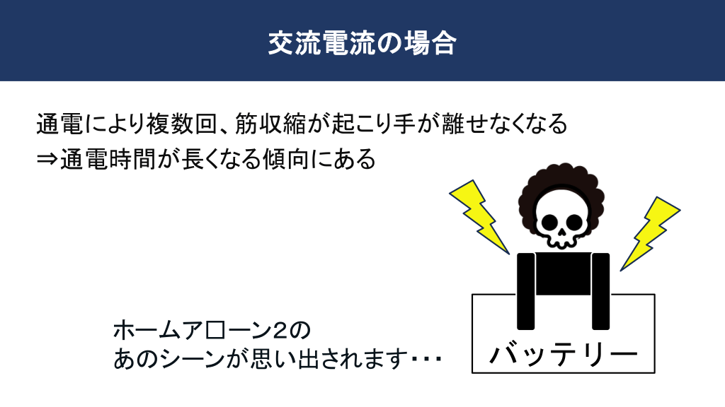 #8. 交流電流の場合 通電により複数回、筋収縮が起こり手が離せなくなる ⇒通電時間が長くなる傾向にある ホームア□ーン2の あのシーンが思い出されます・・・ バッテリー