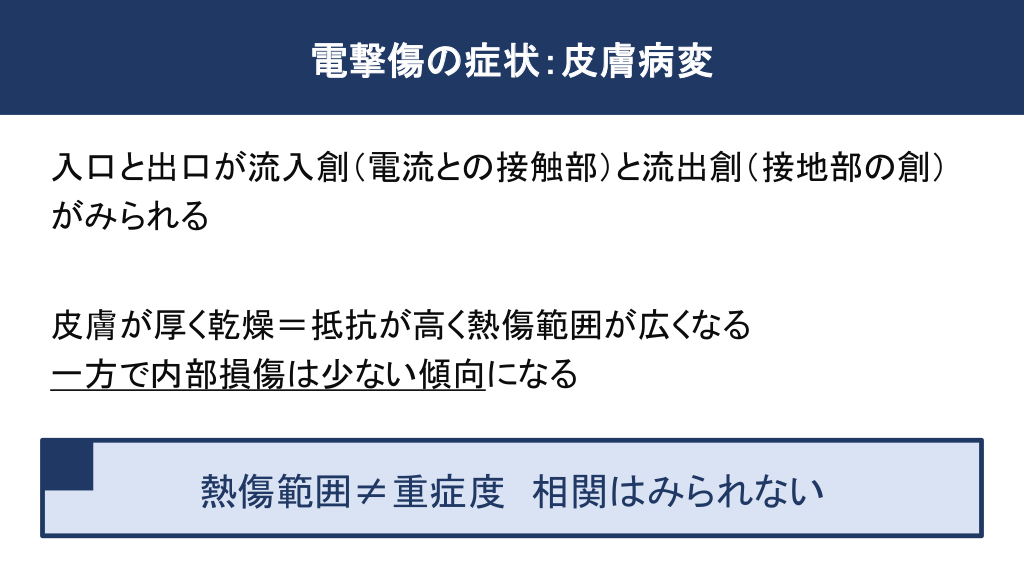 #9. 電撃傷の症状:皮膚病変 入口と出口が流入創(電流との接触部)と流出創(接地部の創) がみられる 皮膚が厚く乾燥=抵抗が高く熱傷範囲が広くなる 一方で内部損傷は少ない傾向になる 熱傷範囲≠重症度 相関はみられない