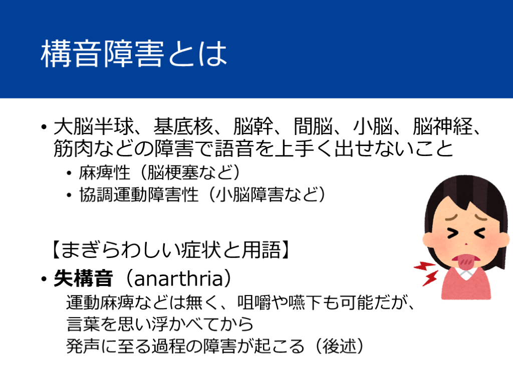 #7. 構音障害とは 大脳半球、基底核、脳幹、間脳、小脳、脳神経、筋肉などの障害で語音を上手く出せないこと