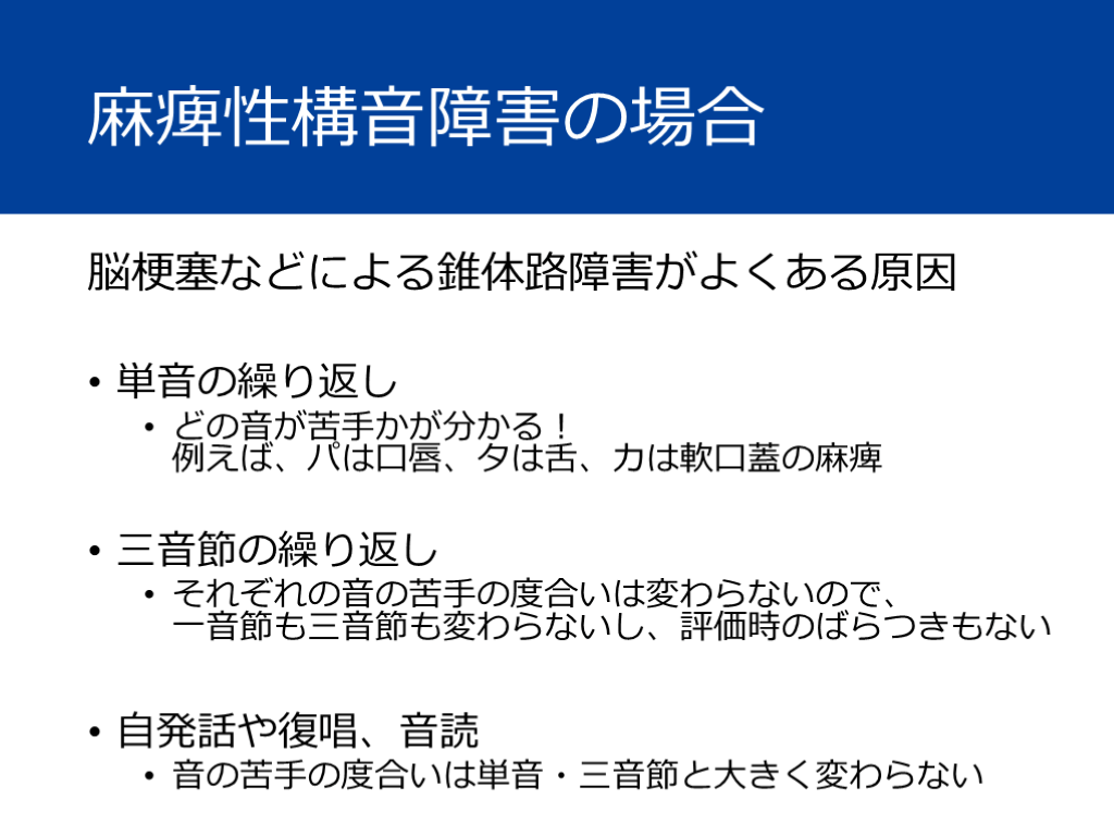 音の苦手の度合いは単音・三音節と大きく変わらない 脳梗塞などによる錐体路障害がよくある原因
