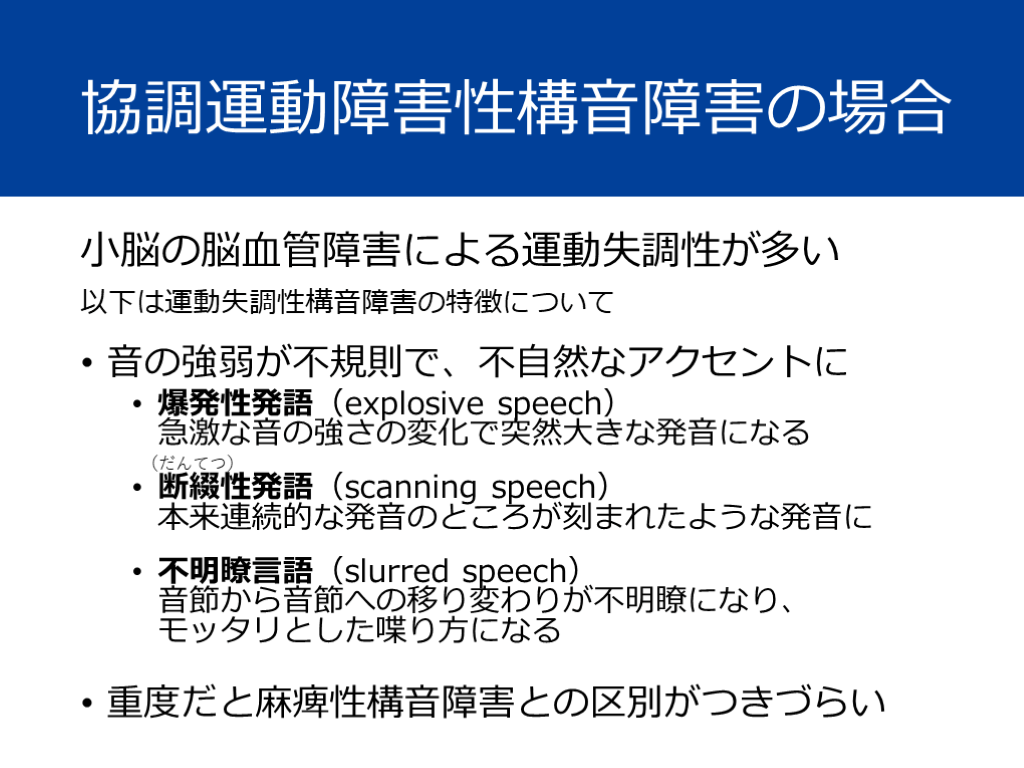重度だと麻痺性構音障害との区別がつきづらい 小脳の脳血管障害による運動失調性が多い