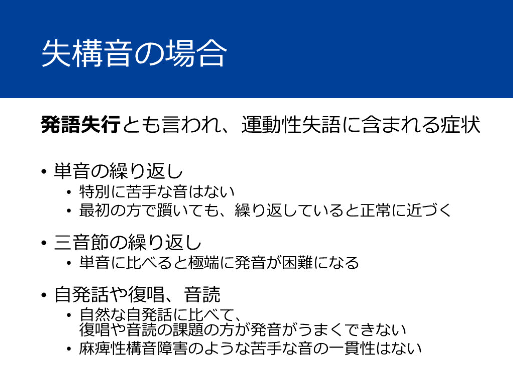 麻痺性構音障害のような苦手な音の一貫性はない 発語失行とも言われ、運動性失語に含まれる症状