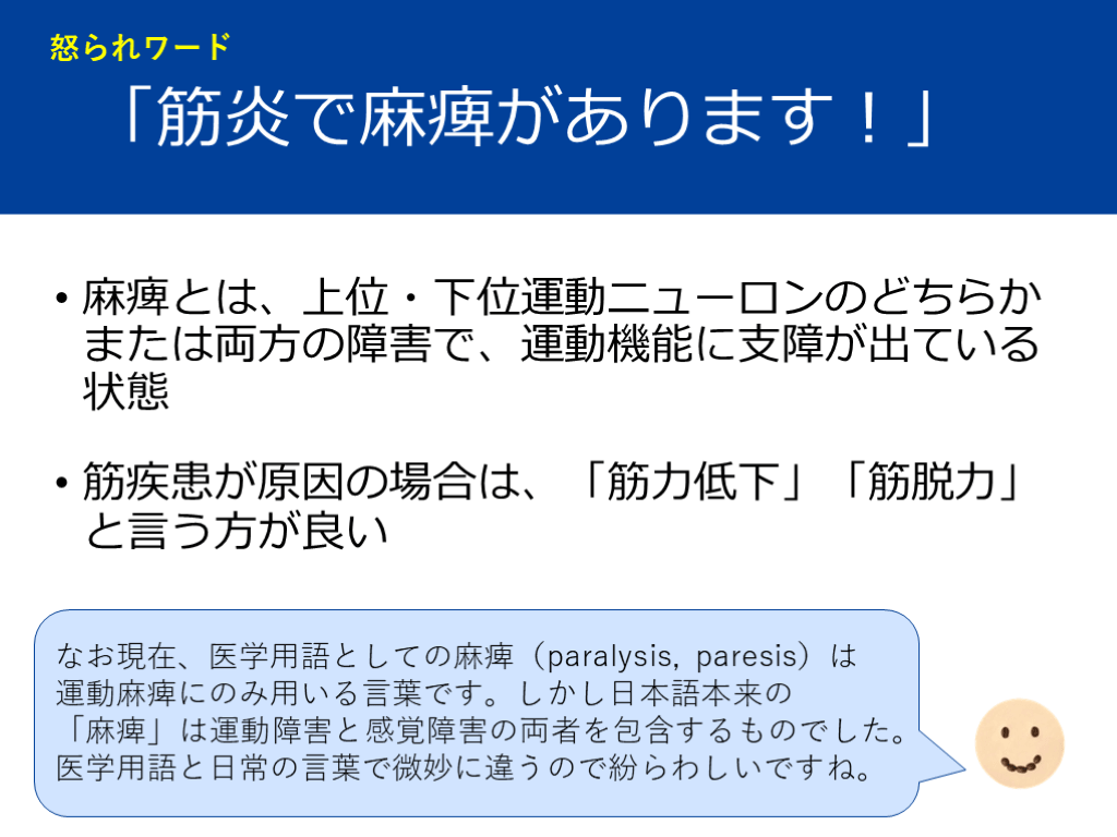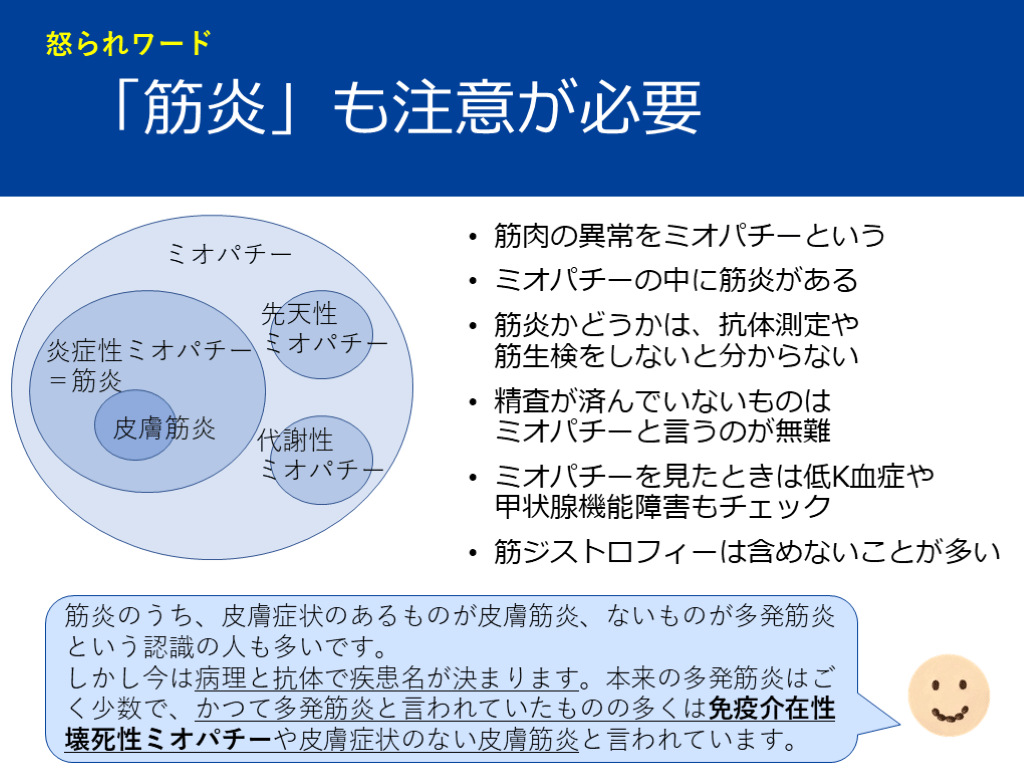 筋炎のうち、皮膚症状のあるものが皮膚筋炎、ないものが多発筋炎という認識の人も多いです。しかし今は病理と抗体で疾患名が決まります。本来の多発筋炎はごく少数で、かつて多発筋炎と言われていたものの多くは免疫介在性壊死性ミオパチーや皮膚症状のない皮膚筋炎と言われています。 怒られワード