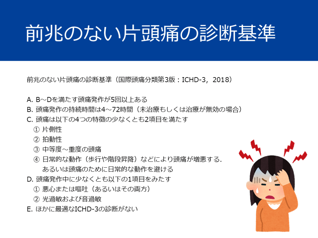 #20. 前兆のない片頭痛の診断基準 前兆のない片頭痛の診断基準(国際頭痛分類第3版:ICHD-3,2018)