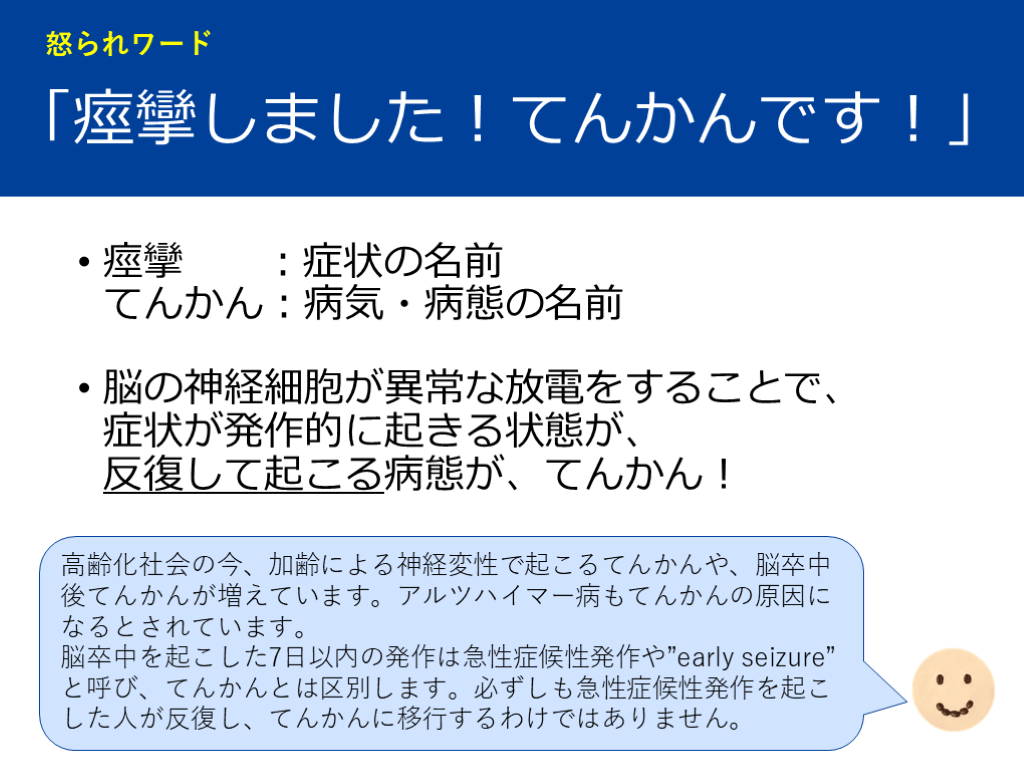 怒られワード 高齢化社会の今、加齢による神経変性で起こるてんかんや、脳卒中後てんかんが増えています。アルツハイマー病もてんかんの原因になるとされています。