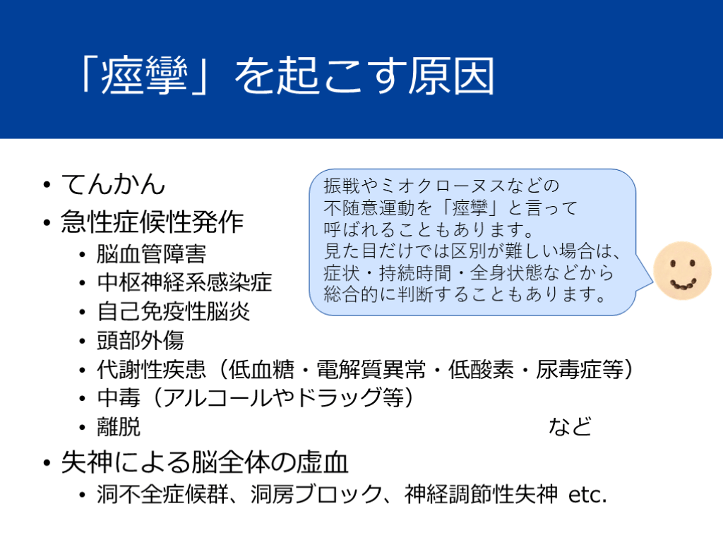 洞不全症候群、洞房ブロック、神経調節性失神 etc. 振戦やミオクローヌスなどの不随意運動を「痙攣」と言って呼ばれることもあります。
