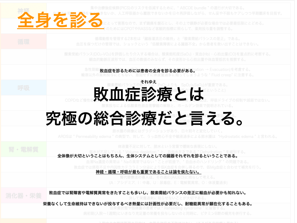 #10. 全身を診る 敗血症を診るためには患者の全身を診る必要がある。 それゆえ 敗血症診療とは 究極の総合診療だと言える。 全体像が大切ということはもちろん、生体システムとしての臓器それぞれを診るということである。 神経・循環・呼吸が最も重要であることは論を俟たない。 敗血症では腎障害や電解質異常をきたすことも多いし、酸素需給バランスの是正に輸血が必要かも知れない。 栄養なくして生命維持はできないが投与するべき熱量には計画性が必要だし、耐糖能異常が顕在化することもある。