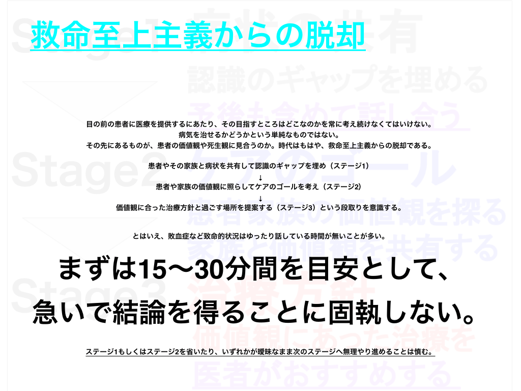 #11. 救命至上主義からの脱却 目の前の患者に医療を提供するにあたり、その目指すところはどこなのかを常に考え続けなくてはいけない。 病気を治せるかどうかという単純なものではない。 その先にあるものが、患者の価値観や死生観に見合うのか。時代はもはや、救命至上主義からの脱却である。 患者やその家族と病状を共有して認識のギャップを埋め(ステージ1) ↓ 患者や家族の価値観に照らしてケアのゴールを考え(ステージ2) ↓ 価値観に合った治療方針と過ごす場所を提案する(ステージ3)という段取りを意識する。 とはいえ、敗血症など致命的状況はゆったり話している時間が無いことが多い。 まずは15〜30分間を目安として、 急いで結論を得ることに固執しない。 ステージ1もしくはステージ2を省いたり、いずれかが曖昧なまま次のステージへ無理やり進めることは慎む。