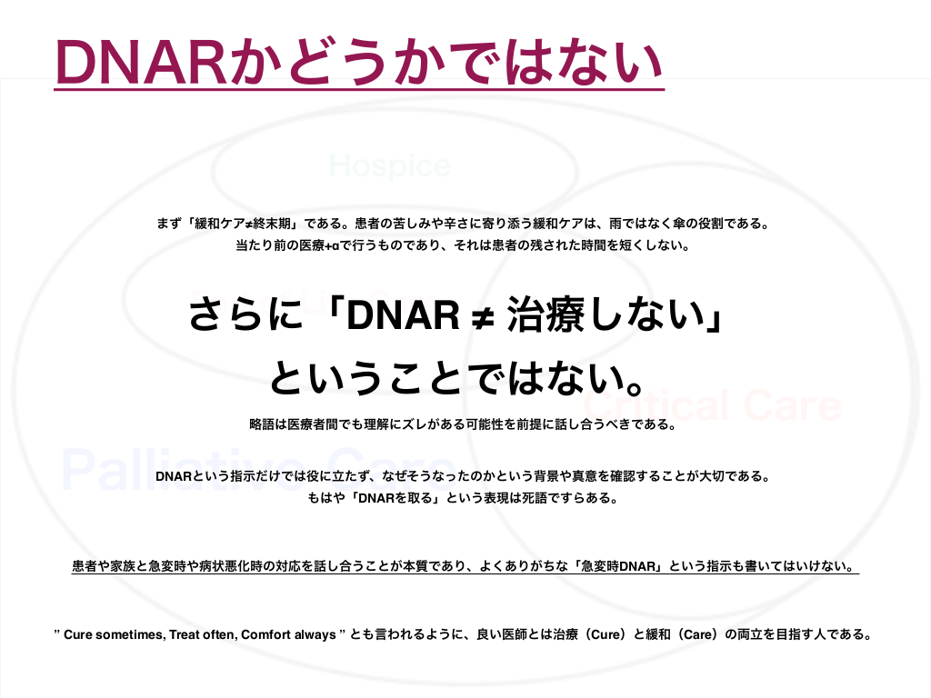 #12. DNARかどうかではない まず「緩和ケア≠終末期」である。患者の苦しみや辛さに寄り添う緩和ケアは、雨ではなく傘の役割である。 当たり前の医療+αで行うものであり、それは患者の残された時間を短くしない。 さらに「DNAR ≠ 治療しない」 ということではない。 略語は医療者間でも理解にズレがある可能性を前提に話し合うべきである。 DNARという指示だけでは役に立たず、なぜそうなったのかという背景や真意を確認することが大切である。 もはや「DNARを取る」という表現は死語ですらある。 患者や家族と急変時や病状悪化時の対応を話し合うことが本質であり、よくありがちな「急変時DNAR」という指示も書いてはいけない。 ” Cure sometimes, Treat often, Comfort always ” とも言われるように、良い医師とは治療(Cure)と緩和(Care)の両立を目指す人である。