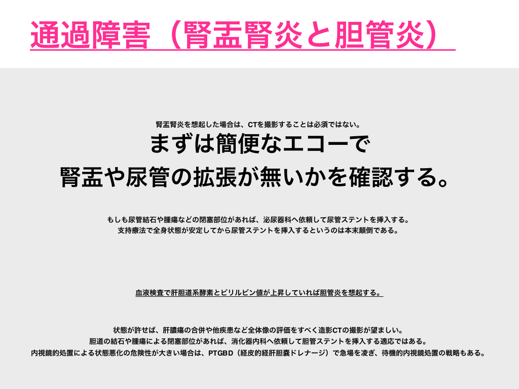 #13. 通過障害(腎盂腎炎と胆管炎) 腎盂腎炎を想起した場合は、CTを撮影することは必須ではない。 まずは簡便なエコーで 腎盂や尿管の拡張が無いかを確認する。 もしも尿管結石や腫瘍などの閉塞部位があれば、泌尿器科へ依頼して尿管ステントを挿入する。 支持療法で全身状態が安定してから尿管ステントを挿入するというのは本末顛倒である。 血液検査で肝胆道系酵素とビリルビン値が上昇していれば胆管炎を想起する。 状態が許せば、肝膿瘍の合併や他疾患など全体像の評価をすべく造影CTの撮影が望ましい。 胆道の結石や腫瘍による閉塞部位があれば、消化器内科へ依頼して胆管ステントを挿入する適応ではある。 内視鏡的処置による状態悪化の危険性が大きい場合は、PTGBD(経皮的経肝胆嚢ドレナージ)で急場を凌ぎ、待機的内視鏡処置の戦略もある。