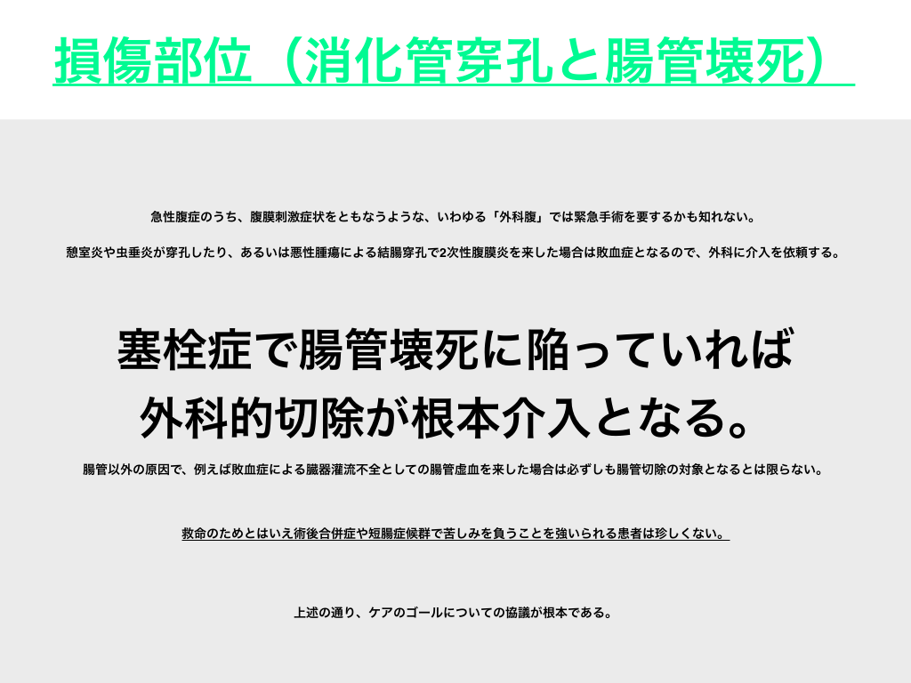 #14. 損傷部位(消化管穿孔と腸管壊死) 急性腹症のうち、腹膜刺激症状をともなうような、いわゆる「外科腹」では緊急手術を要するかも知れない。 憩室炎や虫垂炎が穿孔したり、あるいは悪性腫瘍による結腸穿孔で2次性腹膜炎を来した場合は敗血症となるので、外科に介入を依頼する。 塞栓症で腸管壊死に陥っていれば 外科的切除が根本介入となる。 腸管以外の原因で、例えば敗血症による臓器灌流不全としての腸管虚血を来した場合は必ずしも腸管切除の対象となるとは限らない。 救命のためとはいえ術後合併症や短腸症候群で苦しみを負うことを強いられる患者は珍しくない。 上述の通り、ケアのゴールについての協議が根本である。