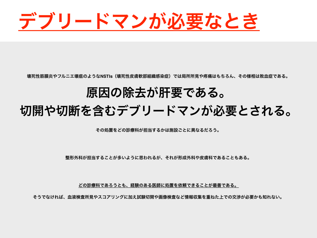 #15. デブリードマンが必要なとき 壊死性筋膜炎やフルニエ壊疽のようなNSTIs(壊死性皮膚軟部組織感染症)では局所所見や疼痛はもちろん、その様相は敗血症である。 原因の除去が肝要である。 切開や切断を含むデブリードマンが必要とされる。 その処置をどの診療科が担当するかは施設ごとに異なるだろう。 整形外科が担当することが多いように思われるが、それが形成外科や皮膚科であることもある。 どの診療科であろうとも、経験のある医師に処置を依頼できることが最善である。 そうでなければ、血液検査所見やスコアリングに加え試験切開や画像検査など情報収集を重ねた上での交渉が必要かも知れない。