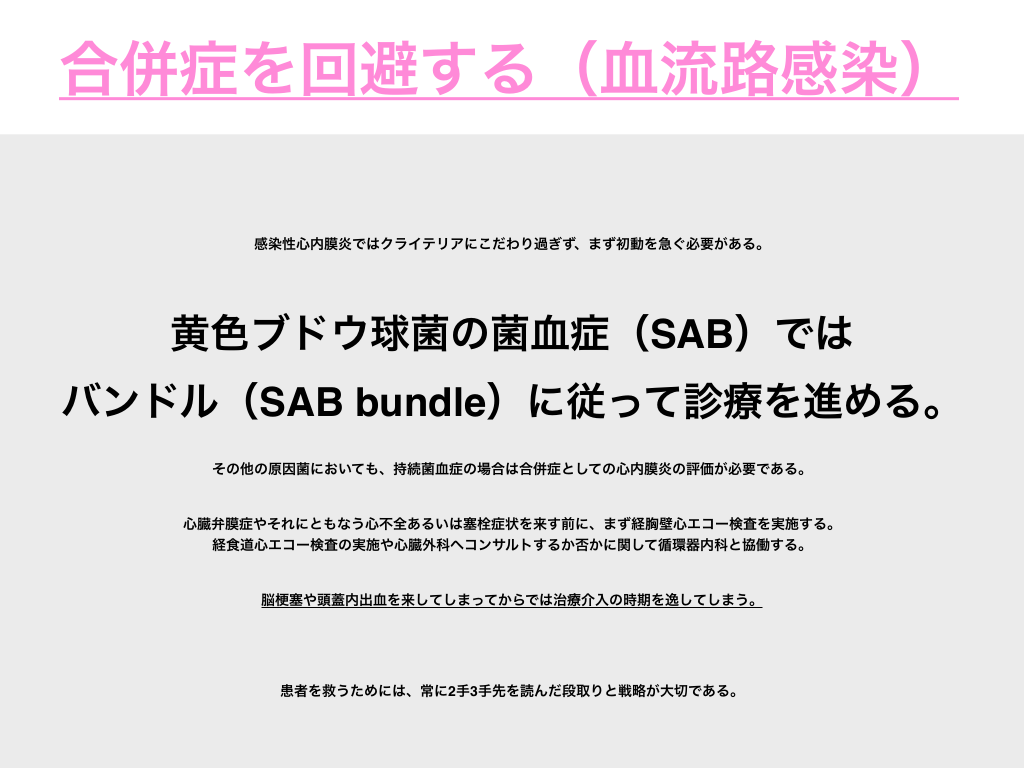#16. 合併症を回避する(血流路感染) 感染性心内膜炎ではクライテリアにこだわり過ぎず、まず初動を急ぐ必要がある。 黄色ブドウ球菌の菌血症(SAB)では バンドル(SAB bundle)に従って診療を進める。 その他の原因菌においても、持続菌血症の場合は合併症としての心内膜炎の評価が必要である。 心臓弁膜症やそれにともなう心不全あるいは塞栓症状を来す前に、まず経胸壁心エコー検査を実施する。 経食道心エコー検査の実施や心臓外科へコンサルトするか否かに関して循環器内科と協働する。 脳梗塞や頭蓋内出血を来してしまってからでは治療介入の時期を逸してしまう。 患者を救うためには、常に2手3手先を読んだ段取りと戦略が大切である。