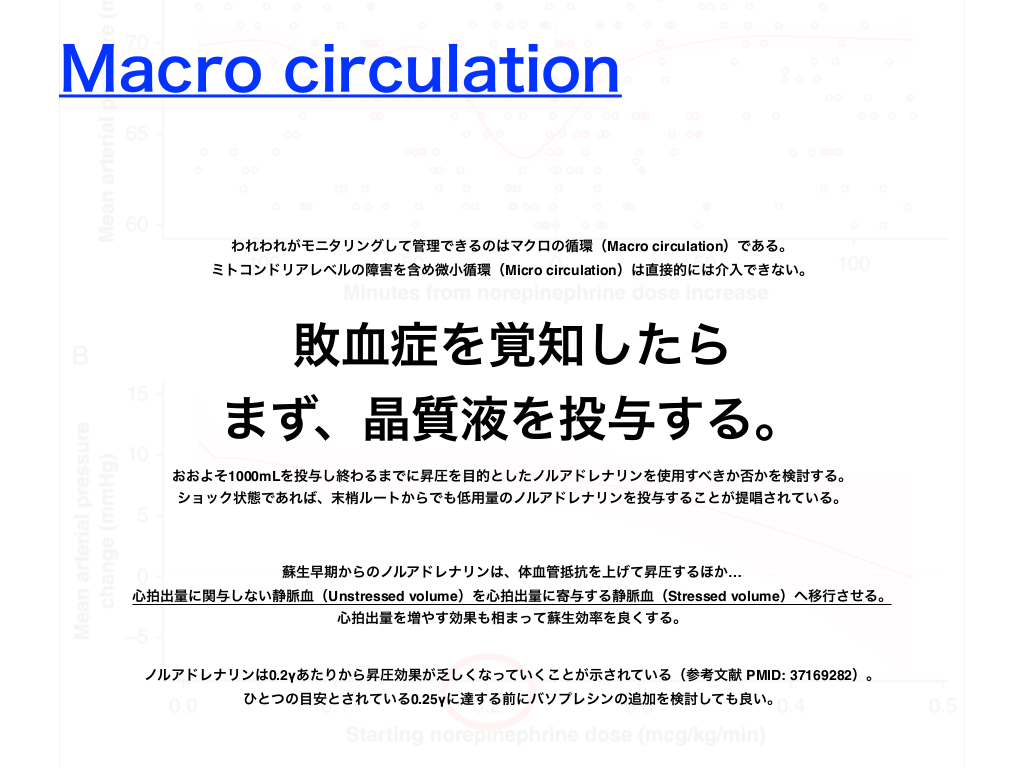 #17. Macro circulation われわれがモニタリングして管理できるのはマクロの循環(Macro circulation)である。 ミトコンドリアレベルの障害を含め微小循環(Micro circulation)は直接的には介入できない。 敗血症を覚知したら まず、晶質液を投与する。 おおよそ1000mLを投与し終わるまでに昇圧を目的としたノルアドレナリンを使用すべきか否かを検討する。 ショック状態であれば、末梢ルートからでも低用量のノルアドレナリンを投与することが提唱されている。 蘇生早期からのノルアドレナリンは、体血管抵抗を上げて昇圧するほか… 心拍出量に関与しない静脈血(Unstressed volume)を心拍出量に寄与する静脈血(Stressed volume)へ移行させる。 心拍出量を増やす効果も相まって蘇生効率を良くする。 ノルアドレナリンは0.2γあたりから昇圧効果が乏しくなっていくことが示されている(参考文献 PMID: 37169282)。 ひとつの目安とされている0.25γに達する前にバソプレシンの追加を検討しても良い。