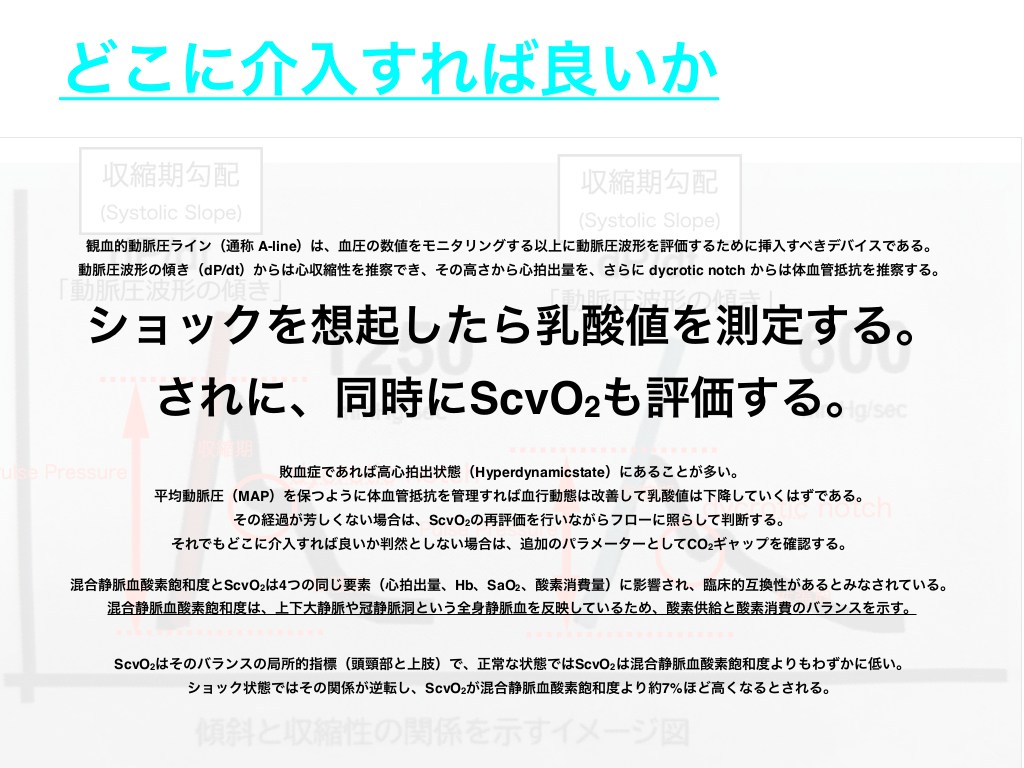 #18. どこに介入すれば良いか 観血的動脈圧ライン(通称 A-line)は、血圧の数値をモニタリングする以上に動脈圧波形を評価するために挿入すべきデバイスである。 動脈圧波形の傾き(dP/dt)からは心収縮性を推察でき、その高さから心拍出量を、さらに dycrotic notch からは体血管抵抗を推察する。 ショックを想起したら乳酸値を測定する。 されに、同時にScvO2も評価する。 敗血症であれば高心拍出状態(Hyperdynamicstate)にあることが多い。 平均動脈圧(MAP)を保つように体血管抵抗を管理すれば血行動態は改善して乳酸値は下降していくはずである。 その経過が芳しくない場合は、ScvO2の再評価を行いながらフローに照らして判断する。 それでもどこに介入すれば良いか判然としない場合は、追加のパラメーターとしてCO2ギャップを確認する。 混合静脈血酸素飽和度とScvO2は4つの同じ要素(心拍出量、Hb、SaO2、酸素消費量)に影響され、臨床的互換性があるとみなされている。 混合静脈血酸素飽和度は、上下大静脈や冠静脈洞という全身静脈血を反映しているため、酸素供給と酸素消費のバランスを示す。 ScvO2はそのバランスの局所的指標(頭頸部と上肢)で、正常な状態ではScvO2は混合静脈血酸素飽和度よりもわずかに低い。 ショック状態ではその関係が逆転し、ScvO2が混合静脈血酸素飽和度より約7%ほど高くなるとされる。