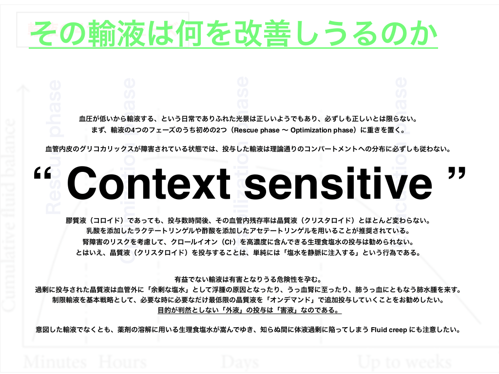 #19. その輸液は何を改善しうるのか 血圧が低いから輸液する、という日常でありふれた光景は正しいようでもあり、必ずしも正しいとは限らない。 まず、輸液の4つのフェーズのうち初めの2つ(Rescue phase 〜 Optimization phase)に重きを置く。 血管内皮のグリコカリックスが障害されている状態では、投与した輸液は理論通りのコンパートメントへの分布に必ずしも従わない。 “ Context sensitive ” 膠質液(コロイド)であっても、投与数時間後、その血管内残存率は晶質液(クリスタロイド)とほとんど変わらない。 乳酸を添加したラクテートリンゲルや酢酸を添加したアセテートリンゲルを用いることが推奨されている。 腎障害のリスクを考慮して、クロールイオン(Cl-)を高濃度に含んできる生理食塩水の投与は勧められない。 とはいえ、晶質液(クリスタロイド)を投与することは、単純には「塩水を静脈に注入する」という行為である。 有益でない輸液は有害となりうる危険性を孕む。 過剰に投与された晶質液は血管外に「余剰な塩水」として浮腫の原因となったり、うっ血腎に至ったり、肺うっ血にともなう肺水腫を来す。 制限輸液を基本戦略として、必要な時に必要なだけ最低限の晶質液を「オンデマンド」で追加投与していくことをお勧めしたい。 目的が判然としない「外液」の投与は「害液」なのである。 意図した輸液でなくとも、薬剤の溶解に用いる生理食塩水が嵩んでゆき、知らぬ間に体液過剰に陥ってしまう Fluid creep にも注意したい。