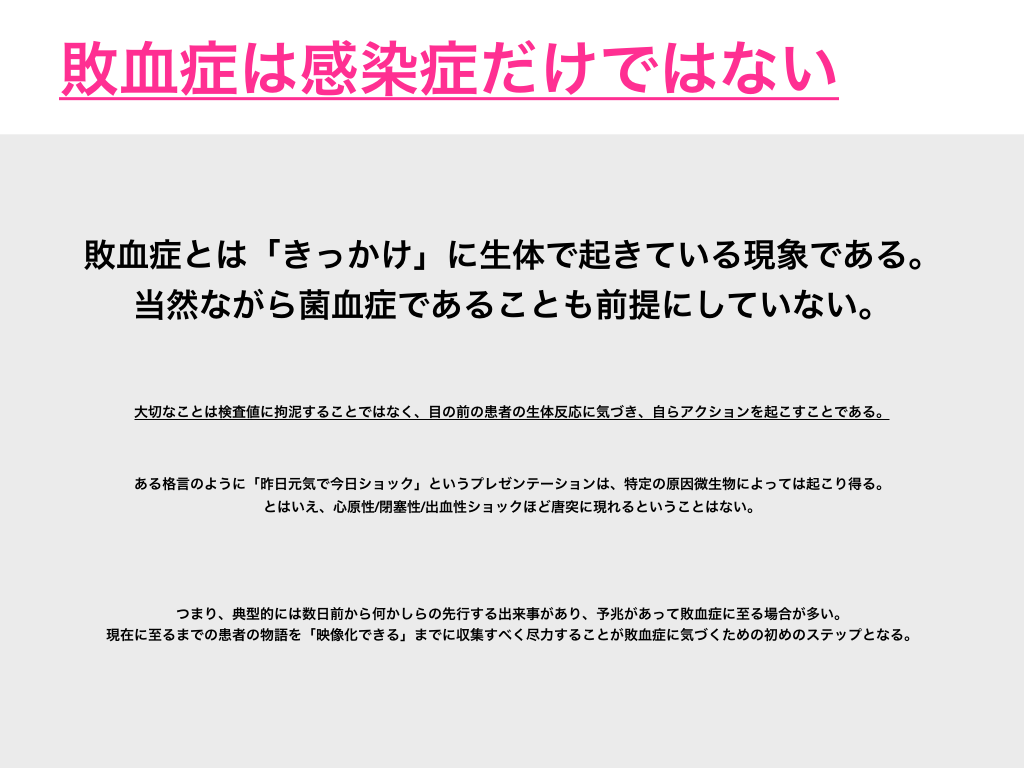 #2. 敗血症は感染症だけではない 敗血症とは「きっかけ」に生体で起きている現象である。 当然ながら菌血症であることも前提にしていない。 大切なことは検査値に拘泥することではなく、目の前の患者の生体反応に気づき、自らアクションを起こすことである。 ある格言のように「昨日元気で今日ショック」というプレゼンテーションは、特定の原因微生物によっては起こり得る。 とはいえ、心原性/閉塞性/出血性ショックほど唐突に現れるということはない。 つまり、典型的には数日前から何かしらの先行する出来事があり、予兆があって敗血症に至る場合が多い。 現在に至るまでの患者の物語を「映像化できる」までに収集すべく尽力することが敗血症に気づくための初めのステップとなる。
