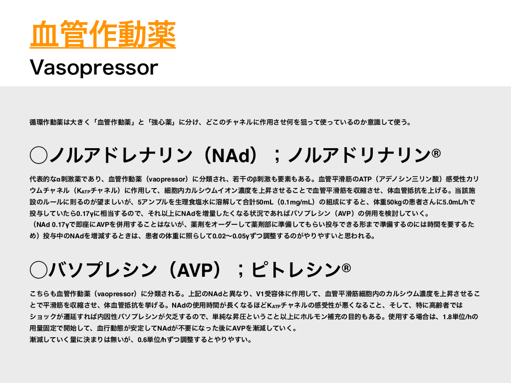 #20. 血管作動薬 Vasopressor 循環作動薬は大きく「血管作動薬」と「強心薬」に分け、どこのチャネルに作用させ何を狙って使っているのか意識して使う。 ◯ノルアドレナリン(NAd);ノルアドリナリン 代表的なα刺激薬であり、血管作動薬(vaopressor)に分類され、若干のβ刺激も要素もある。血管平滑筋のATP(アデノシン三リン酸)感受性カリ ウムチャネル(KATPチャネル)に作用して、細胞内カルシウムイオン濃度を上昇させることで血管平滑筋を収縮させ、体血管抵抗を上げる。当該施 設のルールに則るのが望ましいが、5アンプルを生理食塩水に溶解して合計50mL(0.1mg/mL)の組成にすると、体重50kgの患者さんに5.0mL/hで 投与していたら0.17γに相当するので、それ以上にNAdを増量したくなる状況であればバソプレシン(AVP)の併用を検討していく。 (NAd 0.17γで即座にAVPを併用することはないが、薬剤をオーダーして薬剤部に準備してもらい投与できる形まで準備するのには時間を要するた め)投与中のNAdを増減するときは、患者の体重に照らして0.02〜0.05γずつ調整するのがやりやすいと思われる。 ◯バソプレシン(AVP);ピトレシン こちらも血管作動薬(vaopressor)に分類される。上記のNAdと異なり、V1受容体に作用して、血管平滑筋細胞内のカルシウム濃度を上昇させるこ とで平滑筋を収縮させ、体血管抵抗を挙げる。NAdの使用時間が長くなるほどKATPチャネルの感受性が悪くなること、そして、特に高齢者では ショックが遷延すれば内因性バソプレシンが欠乏するので、単純な昇圧ということ以上にホルモン補充の目的もある。使用する場合は、1.8単位/hの 用量固定で開始して、血行動態が安定してNAdが不要になった後にAVPを漸減していく。 ®︎ ®︎ 漸減していく量に決まりは無いが、0.6単位/hずつ調整するとやりやすい。