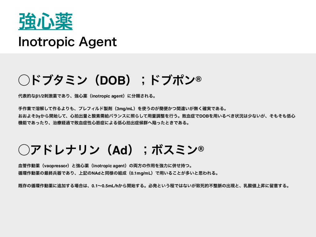 #21. 強心薬 Inotropic Agent ◯ドブタミン(DOB);ドブポン 代表的なβ1/2刺激薬であり、強心薬(inotropic agent)に分類される。 手作業で溶解して作るよりも、プレフィルド製剤(3mg/mL)を使うのが簡便かつ間違いが無く確実である。 おおよそ3γから開始して、心拍出量と酸素需給バランスに照らして用量調整を行う。敗血症でDOBを用いるべき状況は少ないが、そもそも低心 機能であったり、治療経過で敗血症性心筋症による低心拍出症候群へ陥ったときである。 ◯アドレナリン(Ad);ボスミン 血管作動薬(vaopressor)と強心薬(inotropic agent)の両方の作用を強力に併せ持つ。 循環作動薬の最終兵器であり、上記のNAdと同様の組成(0.1mg/mL)で用いることが多いと思われる。 ®︎ ®︎ 既存の循環作動薬に追加する場合は、0.1〜0.5mL/hから開始する。必発という程ではないが致死的不整脈の出現と、乳酸値上昇に留意する。