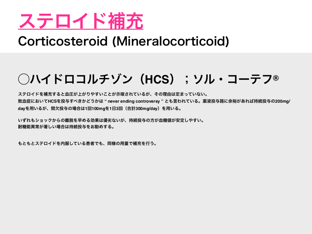 #22. ステロイド補充 Corticosteroid (Mineralocorticoid) ◯ハイドロコルチゾン(HCS);ソル・コーテフ ステロイドを補充すると血圧が上がりやすいことが示唆されているが、その理由は定まっていない。 敗血症においてHCSを投与すべきかどうかは “ never ending controversy ” とも言われている。薬液投与路に余裕があれば持続投与の200mg/ dayを用いるが、間欠投与の場合は1回100mgを1日3回(合計300mg/day)を用いる。 いずれもショックからの離脱を早める効果は優劣ないが、持続投与の方が血糖値が安定しやすい。 耐糖能異常が著しい場合は持続投与をお勧めする。 ®︎ もともとステロイドを内服している患者でも、同様の用量で補充を行う。