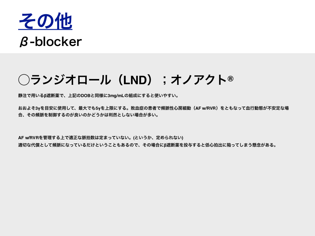 #23. その他 β-blocker ◯ランジオロール(LND);オノアクト 静注で用いるβ遮断薬で、上記のDOBと同様に3mg/mLの組成にすると使いやすい。 おおよそ3γを目安に使用して、最大でも5γを上限にする。敗血症の患者で頻脈性心房細動(AF w/RVR)をともなって血行動態が不安定な場 合、その頻脈を制御するのが良いのかどうかは判然としない場合が多い。 AF w/RVRを管理する上で適正な脈拍数は定まっていない。(というか、定められない) ®︎ 適切な代償として頻脈になっているだけということもあるので、その場合にβ遮断薬を投与すると低心拍出に陥ってしまう懸念がある。