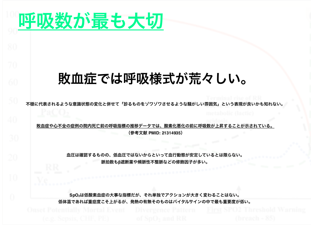 #3. 呼吸数が最も大切 敗血症では呼吸様式が荒々しい。 不穏に代表されるような意識状態の変化と併せて「診るものをゾワゾワさせるような騒がしい雰囲気」という表現が良いかも知れない。 敗血症や心不全の症例の院内死亡前の呼吸指標の推移データでは、酸素化悪化の前に呼吸数が上昇することが示されている。 (参考文献 PMID: 21314935) 血圧は確認するものの、低血圧ではないからといって血行動態が安定しているとは限らない。 脈拍数もβ遮断薬や頻脈性不整脈などの修飾因子が多い。 SpO2は低酸素血症の大事な指標だが、それ単独でアクションが大きく変わることはない。 低体温であれば重症度こそ上がるが、発熱の有無そのものはバイタルサインの中で最も重要度が低い。