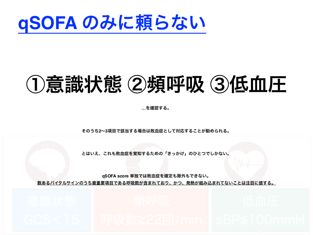 #4. qSOFA のみに頼らない ①意識状態 ②頻呼吸 ③低血圧 …を確認する。 そのうち2〜3項目で該当する場合は敗血症として対応することが勧められる。 とはいえ、これも敗血症を覚知するための「きっかけ」のひとつでしかない。 qSOFA score 単独では敗血症を確定も除外もできない。 数あるバイタルサインのうち最重要項目である呼吸数が含まれており、かつ、発熱が組み込まれてないことは注目に値する。